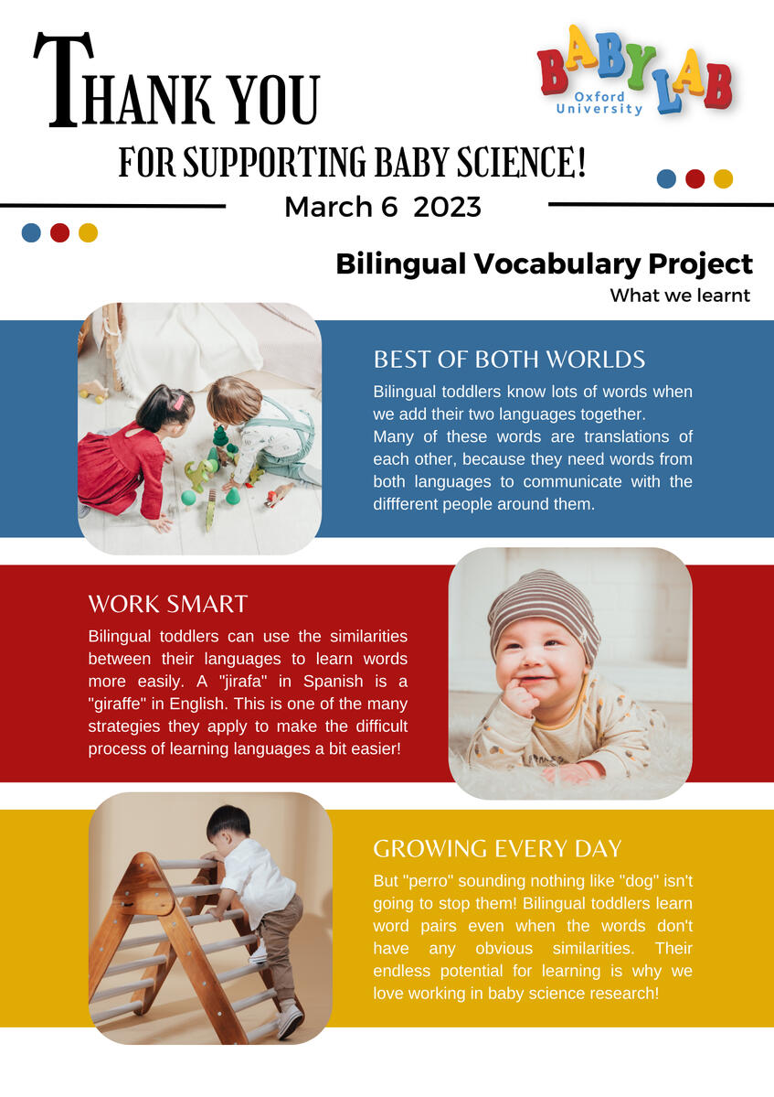 ORA depositSupervisors: Prof Kim Plunkett, Dr Janette Chow (University of Oxford)Babies learn a lot in their early years of life. I study how babies learn their first words. Bilinguals need to learn two times the number of words as monolinguals. Some words sound more like each other than others – does this make these words easier to learn? My work looks at how these words that sound alike (cognates) may change how babies learn words and recognise them.